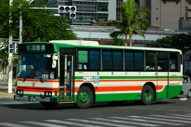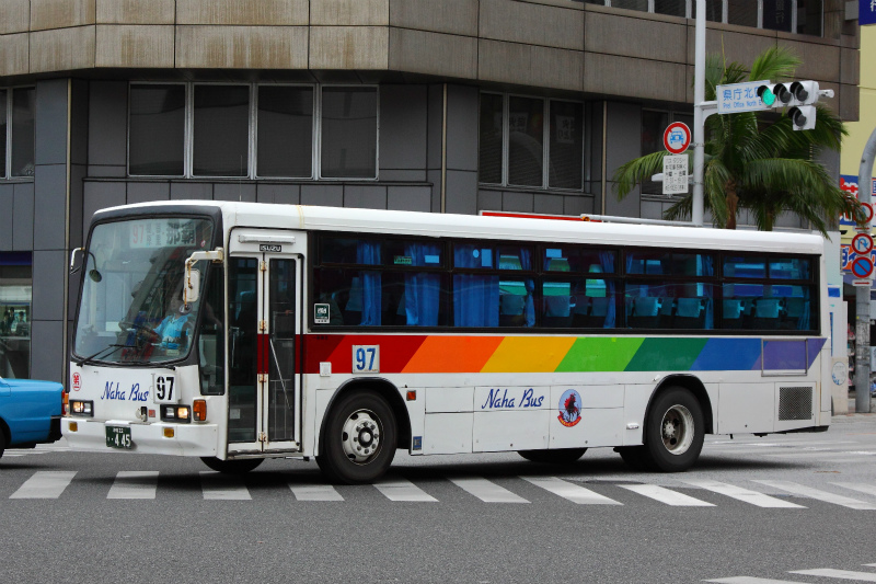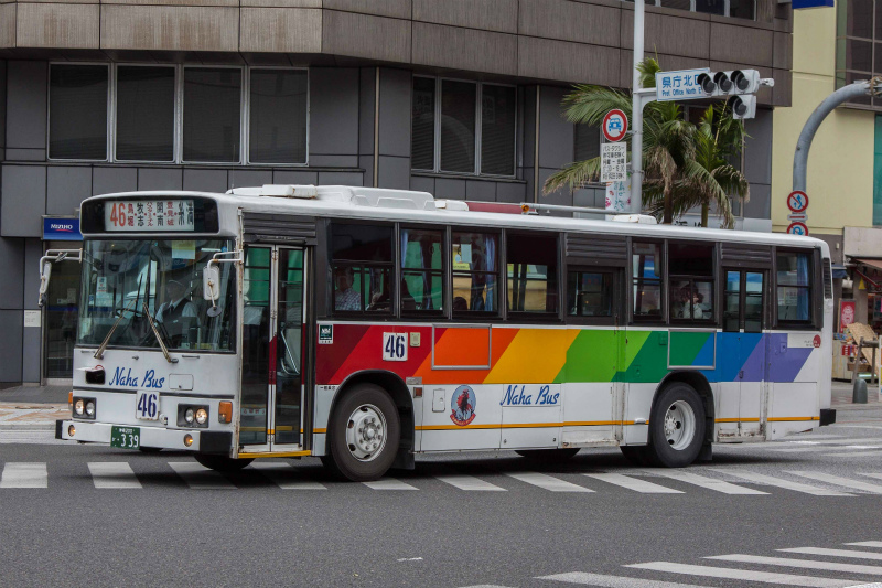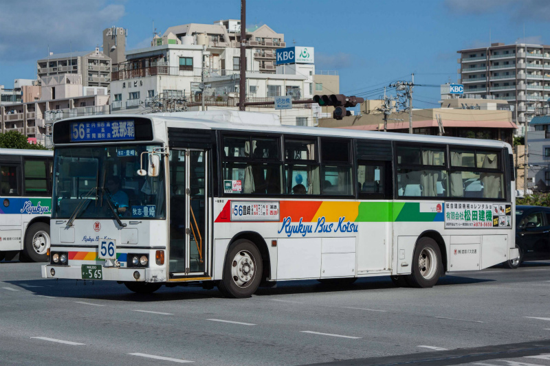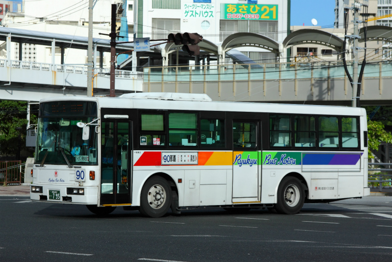 琉球バス交通 沖縄200か・795 日産ディーゼルKC-UA460HSN/富士重工7E(R17E) FHI/1998(元東急バスKA1700) 琉球バス交通、東急バスより移籍の日産ディーゼルKC-UA・富士重工7E。年式を問わずに見るとおよそ15台の仲間と共に沖縄の地へ渡り、東急バス時代には装備されていなかったフォグランプも未設置のまま、現在も活躍しています。前回の記事の那覇バス339号車と比較するとほぼ差が無く、同一の塗装を採用している事が分かります。那覇バスと琉球バス交通はそれぞれ前社号時代、経営危機に陥り第一交通産業傘下において経営を再建。経営統廃合は行われませんでしたが、琉球バス交通発足以降に導入された車両については同一塗装を採用する運びとなりました。 | カテゴリー