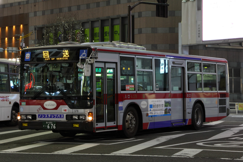 東急バス トランセ淡島営業所所属 A378 品川200か・676 三菱ふそうKL-MP37JK MFBM/2002 今日は10月9日、東急の日という事で・・・三菱ふそうエアロスター・ノンステップですが、先日掲載したA495号車よりも前に導入された車両で、非公式側最後部の窓の大きさが異なっています。A378号車は前面左側、及び両側面・リアにあるNon-Step Busの文字の横に赤文字で「109」の表記が入ります。東急バスでは比較的初期に導入されたノンステップバスにこの表記が付けられていましたが、車体再生時の再塗装などで撤去され、徐々に数を減らしてしまいました。しかしながら、A378号車に限っては再生後も「109」の表記が残されたまま引退まで活躍しました。2014年後半に東急バスからは引退となりましたが、現在は茨城県の関東鉄道バスへ移籍、つくば中央営業所配置の「9402YT」として第二の活躍をしています。 撮影日:2014年3月29日 PR | カテゴリー