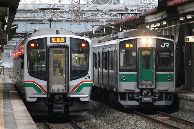 E721系と701系の並び。右側の車両にも乗車しましたが結構衝撃的でした(ぇ