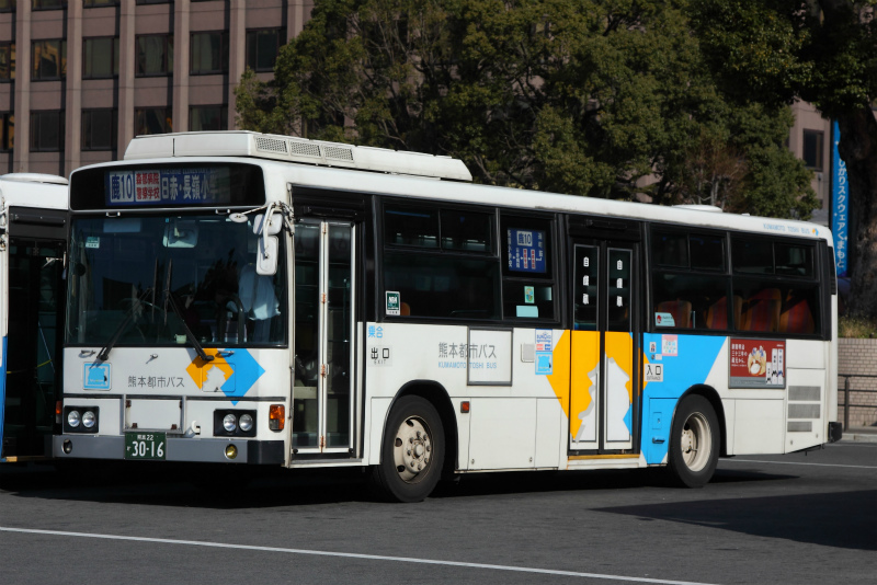 かつて東京都交通局(都営バス)に多数存在した日野ブルーリボンリフト付超低床バス、HU2ML改。1台当たりの価格が非常に高価であったため、都営バス以外での導入は大阪市交通局(前後ドア車)と、ここ熊本市交通局(前中ドア)のみでした。都営バスの車両は排ガス規制の影響を受け、2005年までに全廃、大阪市交通局の車両は栃木県の関東自動車に移籍しています。熊本都市バスの車両は都営バスに在籍した車両に形態が近く、個人的に親近感の湧く1台です。3015、3016の2台が在籍しましたが、3015号車の方が2016年に廃車となった為、全国的に見てもこの1台のみとなりました。尚、熊本都市バスの車両はリフトやスロープ類の装備は付いておらず、車椅子等には対応していません。 撮影日:2017年2月28日 登録番号:熊本22か30-16 社番(所属):3016(小峯営業所) メーカー:日野 型式:HU2ML改 車体:ブルーリボン 年式:1995 移籍等:熊本市交通局→熊本都市バス PR | カテゴリー
