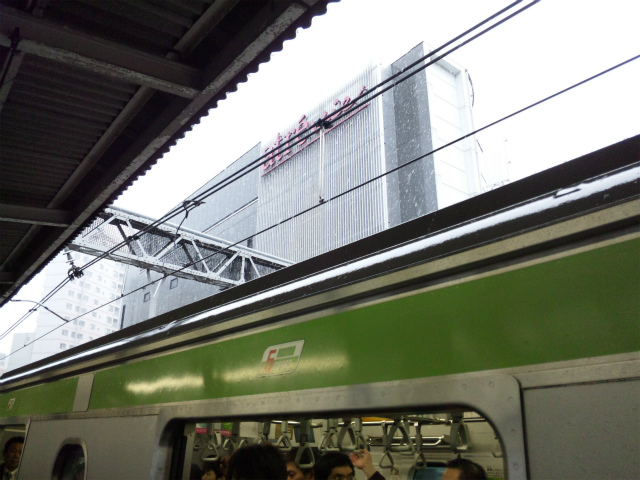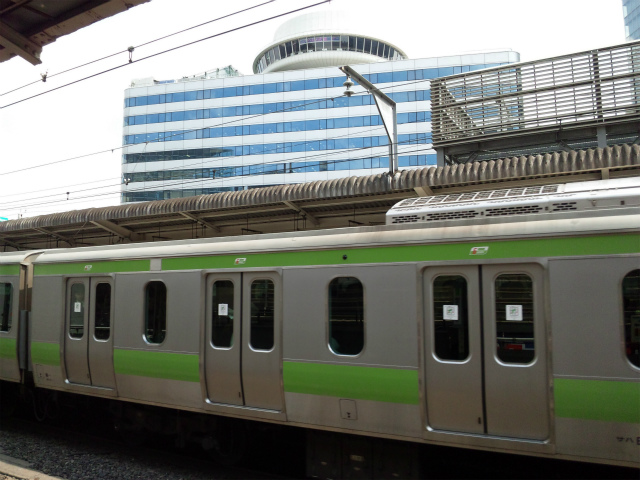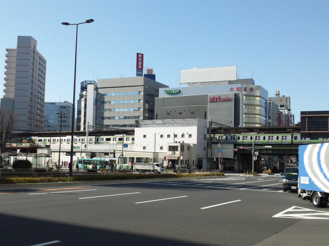 東口側の路上から 山手線内で6ドア車が2両入るのはおそらくここだけと思われます。