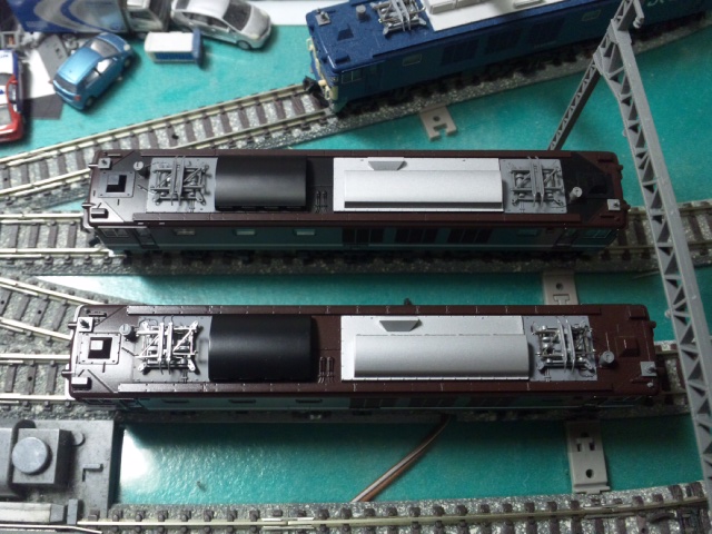 やはり車輪の違いが目立ちます。パンタグラフも両者で材質が違い、KATOは金属、TOMIXはEF65PF型やEF66等でおなじみのプラスチック製です。全体的にTOMIXの方が車高が低く感じます。分かりにくいですが、TOMIX製品は屋根上モニター部分にもガラスパーツが入っています。