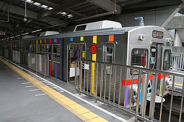 「多摩川アートライン・プロジェクト」の主催で虹色装飾が施され「レインボートレイン」となっている7903F。7700系はいつも地味な車両(失礼)であるためとても華やかな印象を受ける。(蒲田)