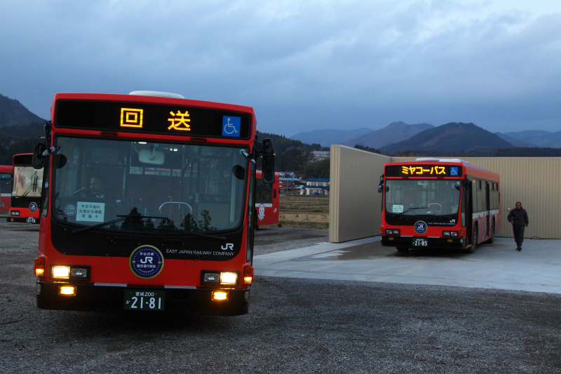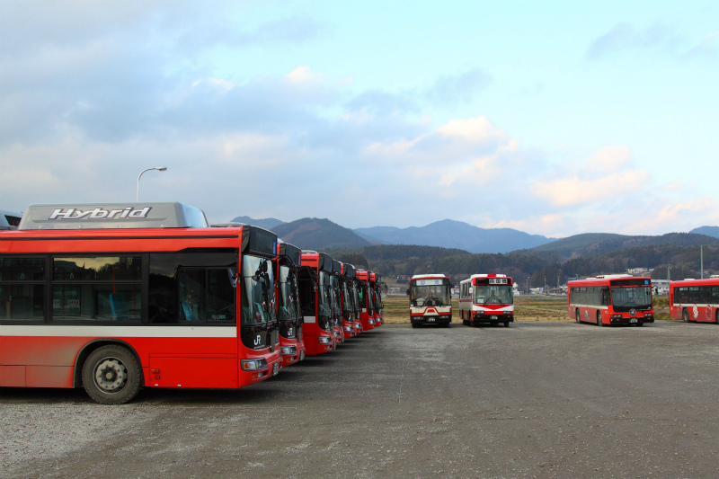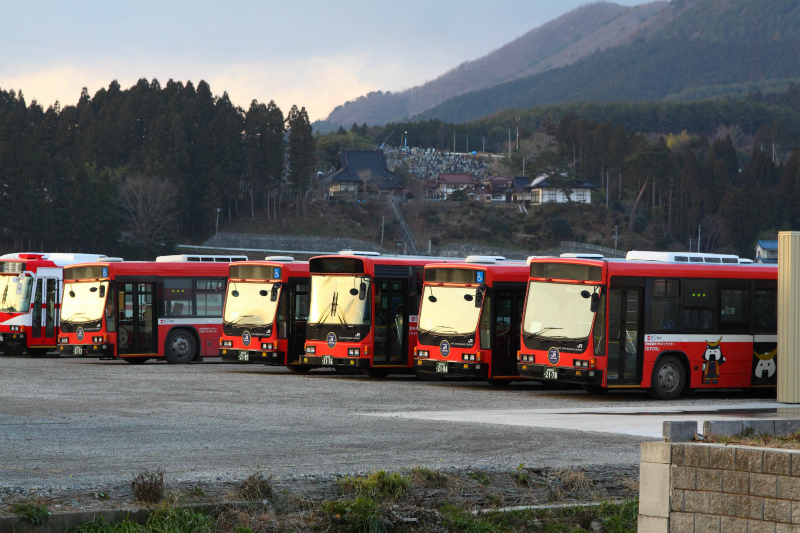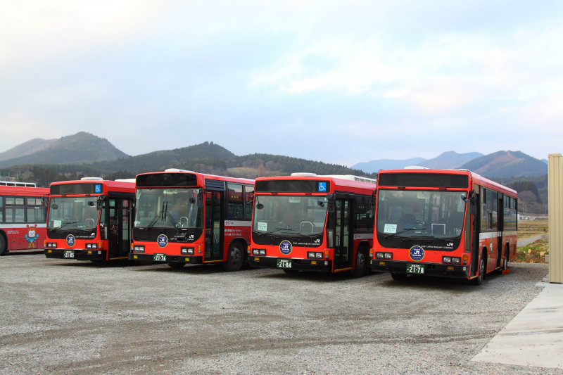 営業所を見回すと、本格運行を前に、JR東日本保有となる新製車両、BRCハイブリッドが並んで留置されています。今後の主力車両になるそうで、先ほどのキュービック達はどうなるのでしょう・・