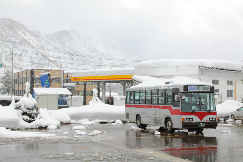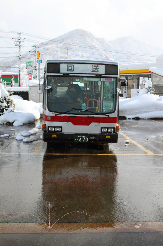 ラストは雪山をバック、路面に反射する670号車を撮り、六日町営業所を後にしました。