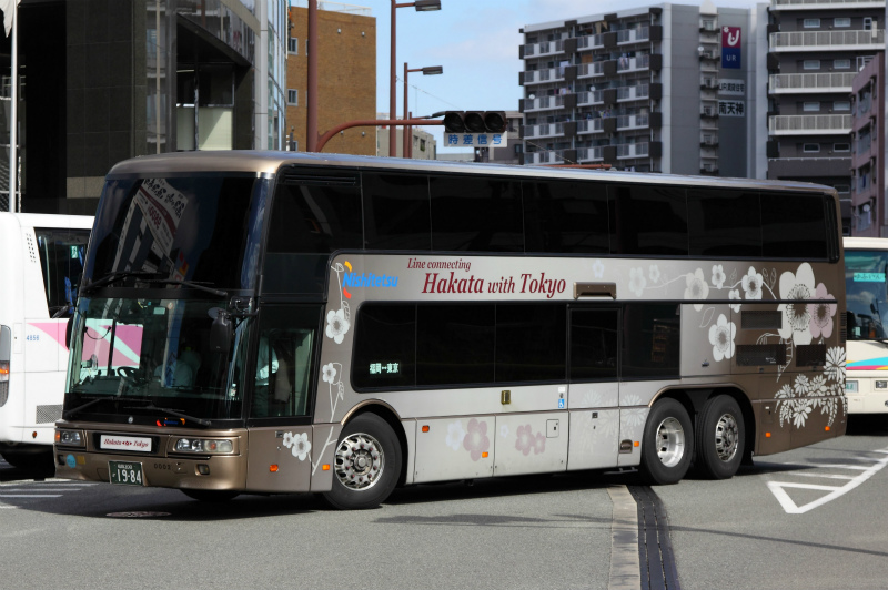 西鉄バス 博多自動車営業所所属 0002(晩年0004に改番) 福岡200か19-84 三菱ふそうBKG-MU66JS MFBM/2009 あの有名な長距離バス「はかた号」専用として導入された三菱ふそう製の2階建てバス、エアロキング。2009年に同型車の0001(後0003)と同時に導入されました。白夜行に続く二代目の車両となり、東京都と福岡県の花である桜と梅をあしらった公募デザインが採用されました。2014年12月、はかた号としては明確な三代目となる新型車両エアロクイーンの導入に伴い、主役の座を譲る事となりました。その後しばらくは続行便の車両として0001→0003、0002→0004へと改番された上で使用されましたが、現在は引退となりました。 撮影日:2014年11月3日 PR | カテゴリー