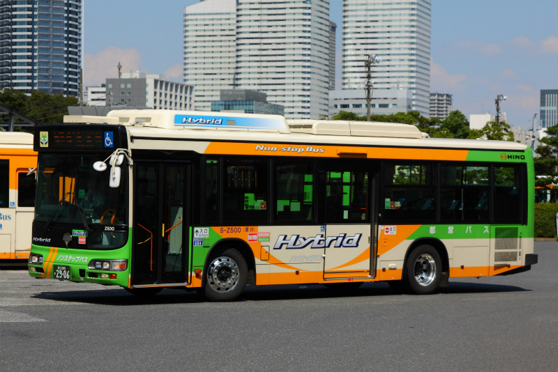 東京都交通局 深川自動車営業所所属 S-Z500 足立200か29-06 日野LNG-HU8JLGP改 J-BUS/2014 日野ハイブリッドシリーズその4、いよいよブルーリボンシティとしての最終形態です。2012年5月にマイナーチェンジされ、通常のLNG-規制車はLKG-規制車とは規制ステッカー以外での差異はありませんが、2014年4月、東京都交通局に2台導入された車両は試験車となり、各部が異なる物となりました。東急バスにも1台が導入されました(既引退)。外観上では、前側の屋根上のバッテリーユニットが薄型・小型化され、後部クーラーがいすゞエルガ等に搭載されているデンソー製の物に変更されました。観光バス等と同じアルミホイールを履き、中ドア上には車外灯を装備、車体後部には試作車らしく「HINO」のロゴが貼付されています。内部構造では、これまでのMTミッションではなく、AMTに変更され、エンジンも専用新設計の物が採用されました。導入当初は系統固定でデータの取得や試験が行われましたが、次第に他の系統へも運用されるようになります。その後Z500、Z501の2台とも各種試験が終了、2015年9月に除籍となり日野自動車へ返却されました。暫く動向が分からないままでしたが、2016年6月より2台のうちどちらかがバンコクの地へ渡り、期間限定ではあるものの、試験運行を行っている様です。 ここまで4回に渡り、ACG-、BJG-、LKG-、LNG-の各モデルを取り上げて来ました。次回は比較画像等を用いて形態差異の比較をして行こうと思います。 撮影日:2015年9月12日 PR | カテゴリー