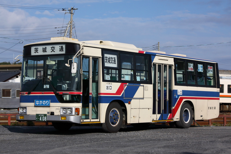 東京都交通局(都営バス)から茨城交通へ移籍したエアロスターK。茨城交通では少数派であった三菱ふそう大型車で、近年では移籍車が増えつつありますが、408号車の導入当時では自社発注車が中心で、その中でも新呉羽エアロスターKとして異彩を放っていました。東京都交通局のエアロスターKの移籍車はかつて各地に点在していましたが、いずれも経年により引退が進む中、茨城交通の408号車は近年まで活躍を続けました。2016年に廃車となり、首都圏地域では東京都交通局からの移籍車エアロスターKは全廃となりました。 撮影日:2015年10月17日(貸切乗車会時に撮影) 登録番号:水戸200か408 メーカー:三菱ふそう 型式:U-MP218K 車体:新呉羽 年式:1991 移籍等:東京都交通局(X446)→茨城交通 | カテゴリー